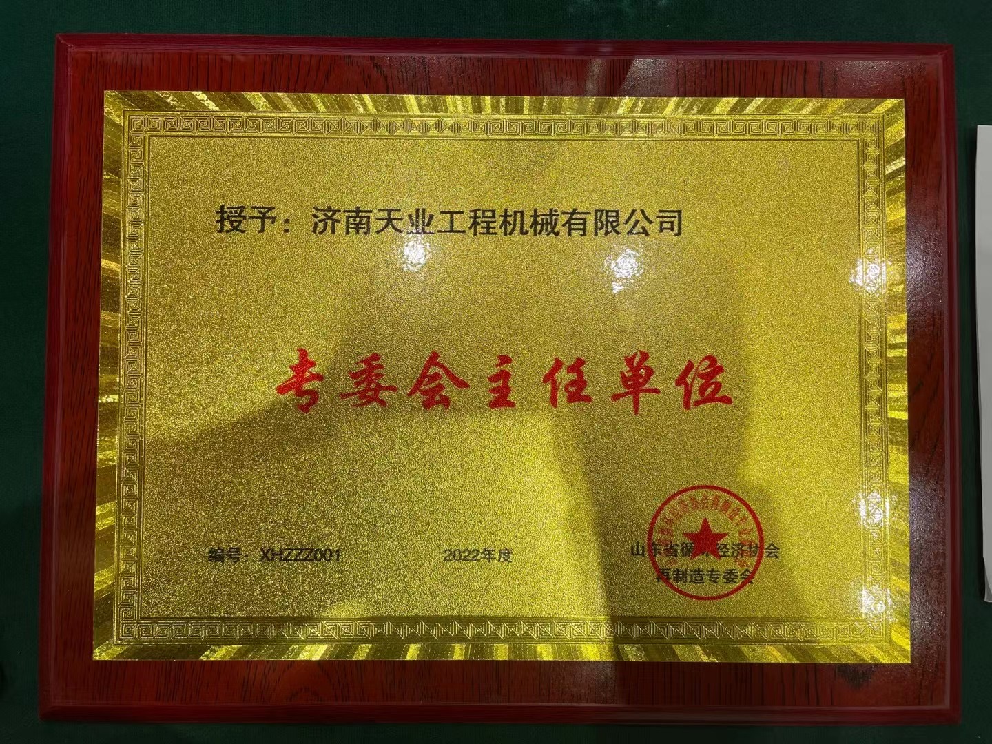 張忠蓮秘書長為濟南天業(yè)工程機械有限公司頒發(fā)“專委會主任單位”牌匾,同時為孫超總經(jīng)理頒發(fā)專家委任證書。